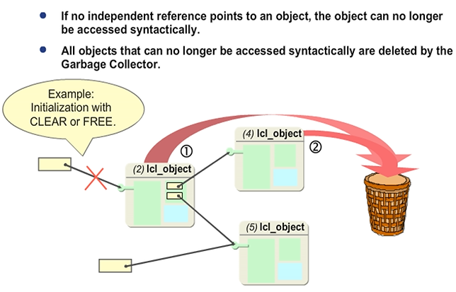 In this example, the reference to object (2) LCL_OBJECT is initialized. However, there is no subsequent reference point to this object. Therefore, the Garbage Collector deletes the unreferenced object. Because there is no reference point to object (4) LCL_OBJECT, it is also deleted.