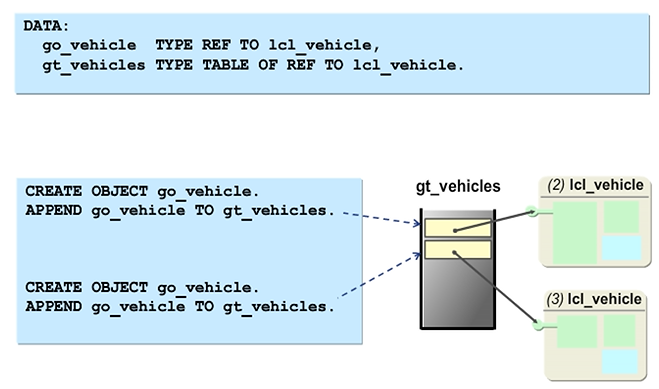 To keep several objects from the same class in your program, you can define an internal table with one column that contains the object references for this class. To maintain the objects in the table, you can use statements for internal tables, such as APPEND, READ, or LOOP.