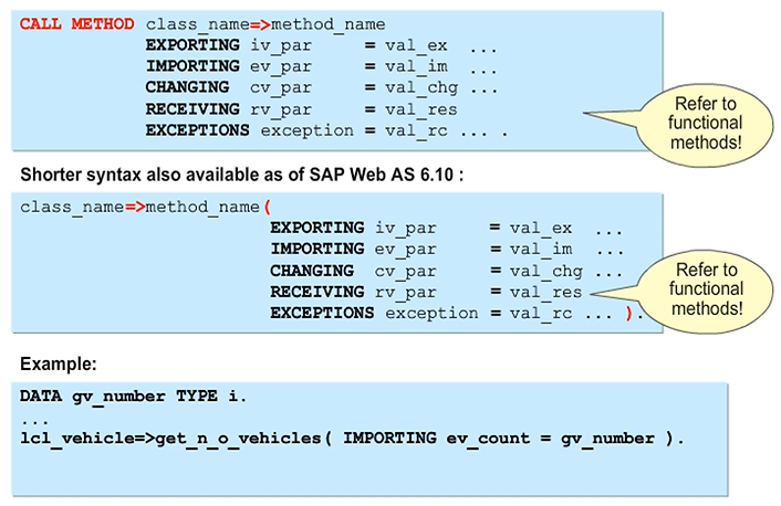 A shorter syntax is also supported as of SAP NetWeaver Application Server (SAP NetWeaver AS) 6.10. In this version, omit CALL METHOD and list the parameters in parentheses. There must be no space before the parentheses, but there must be at least one space after the parentheses. When you call a method that has only one import parameter, you can specify the actual parameter in the parentheses without any other additions. When you call a method that only has import parameters, you can omit the EXPORTING addition.
