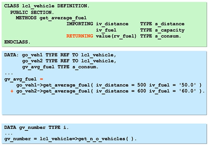 The second example shows the call of a functional static method in short form. The GV_NUMBER data object is the actual parameter for the RETURNING parameter of the method. The detailed syntax is as follows: