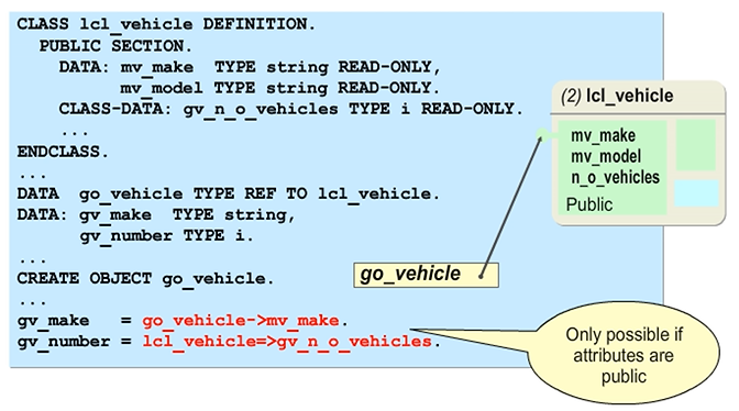 You access public attributes from outside the class in the same way as method calls. You can access static attributes using CLASSNAME=>STATIC_ATTRIBUTE. Access instance attributes with REF->INSTANCE_ATTRIBUTE.