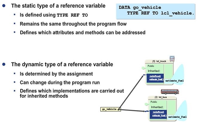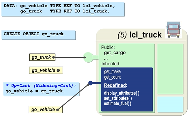 In this example, after the assignment, you can only access the methods GET_MAKE, GET_COUNT, DISPLAY_ATTRIBUTES, SET_ATTRIBUTES, and ESTIMATE_FUEL of the instance LCL_TRUCK by using the reference GO_VEHICLE.