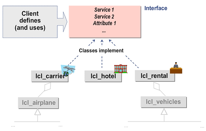 Compared to regular inheritance, the distribution of roles in interfaces is sometimes different. The user generally defines the interfaces. In these interfaces, the user describes both technically and semantically the services that the user wants the providers to offer. Each class can now decide for itself whether it serves the interface, that is, whether it actually offers the services defined in the interface. Therefore, this case is similar to a specialization relationship with a subclass.
