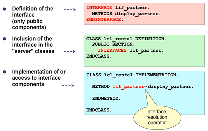 In ABAP Objects, the same components can generally be defined in interfaces and classes. To recognize the semantic differences from regular inheritance, you can concentrate on the following use cases.