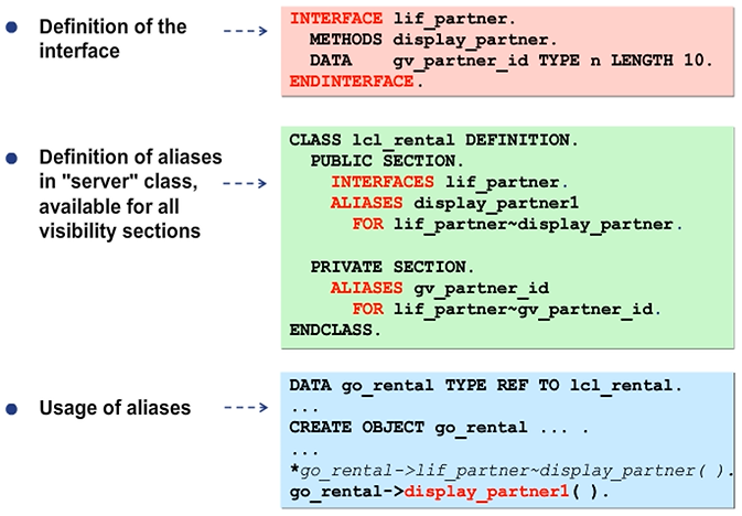 To simplify access to interface components, you can use alias names. These alias names can appear in the definition part of a class. The use of alias names is subject to the visibility restriction of the defining class.