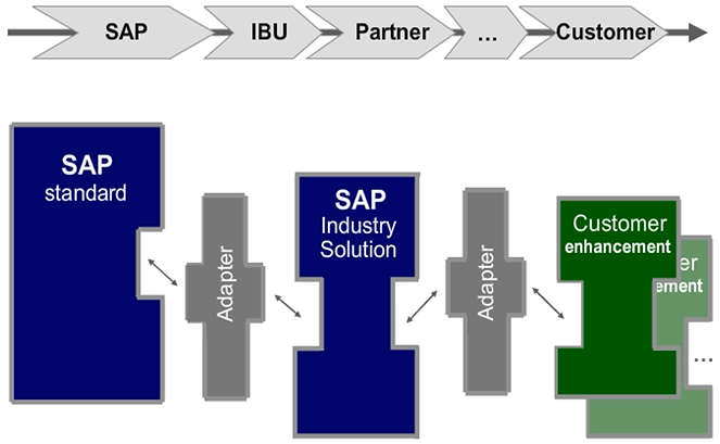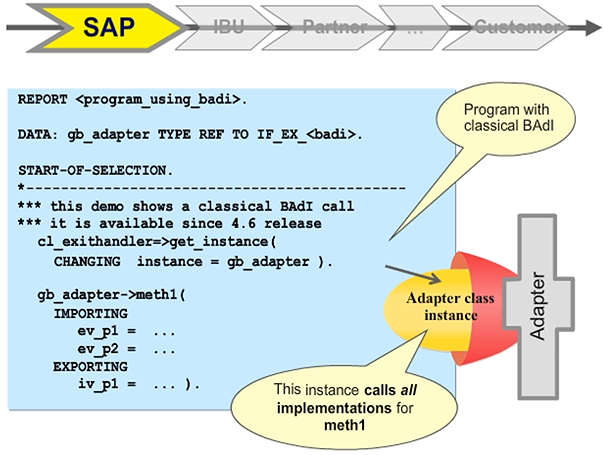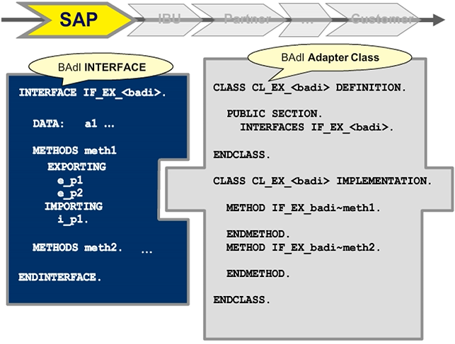 With a BAdI, an SAP application provides the enhancement option through an interface and an adapter class implementing that interface.