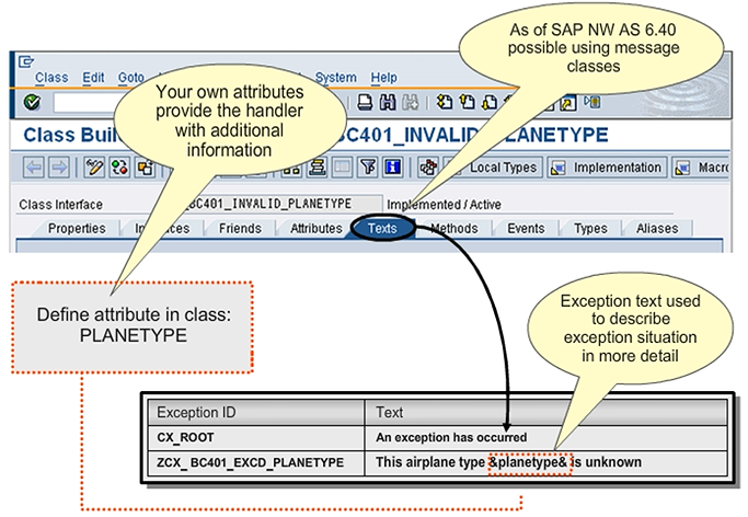 In releases before SAP NetWeaver AS 6.40, exception texts for global exception classes and their translations were stored in OTR. You can assign several texts to a single class. You assign a text to an exception using the TEXTID attribute, which contains the globally unique ID of the text object in OTR in an instance at runtime. The GET_TEXT method then exports this text, replaces any text parameters with the contents of the relevant attributes as required, and returns the text as a character string.