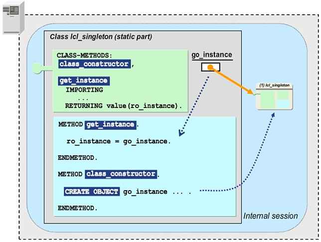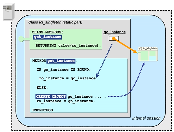 There are various different ways to implement a singleton class. The first singleton pattern is a special case of the factory concept. Instead of storing several instances, the class stores only one instance. When the factory method GET_INSTANCE is called for the first time, it instantiates the class. For every subsequent call, it returns the reference to the existing object.