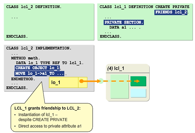 To create friendship, use the FRIENDS addition of the CLASS statement or the FRIENDS tab page in the Class Builder. All classes and interfaces to which friendship is granted are listed there.