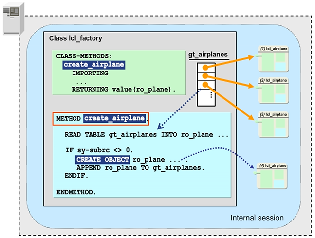 In the example, LCL_FACTORY serves as a factory class for airplanes. LCL_FACTORY class provides a public method CREATE_AIRPLANE in which CREATE_AIRPLANE either instantiates class LCL_AIRPLANE or returns a reference to an already existing instance. To restrict the instantiation, class LCL_AIRPLANE is defined with addition CREATE PRIVATE. By adding FRIENDS LCL_FACTORY, the friendship allows the factory class and only the factory class to create airplane instances and to access the private attributes.