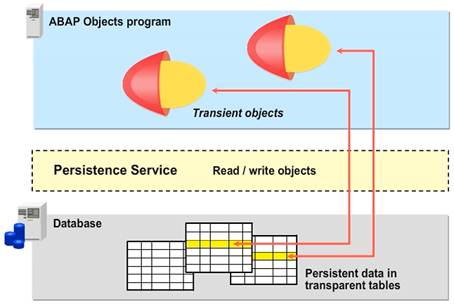 For this purpose, the persistence services for ABAP Objects were introduced in SAP NetWeaver Application Server (SAP NetWeaver AS). On request, the ABAP developer can use these services and write the current attribute values of objects as persistent to the associated transparent tables. To read the values from the tables, persistent services can be used to import the values into an object previously defined as persistent. When doing this, the persistence services use the ABAP Open SQL interface.