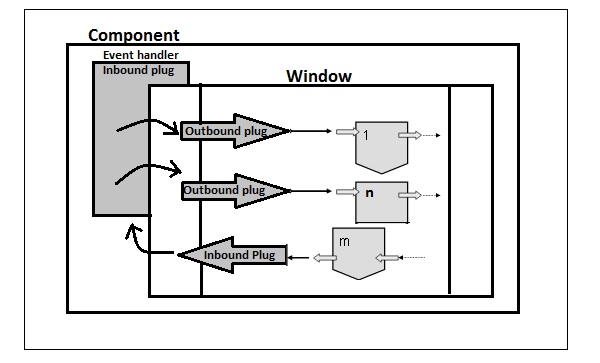 Each window contains an inbound and an outbound plug and they can be included in a navigation chain. Inbound plugs within a window lead from the outbound plug of a view to the embedding window. Just like all other inbound plugs, they represent an event and thus call the event handler assigned to them.
