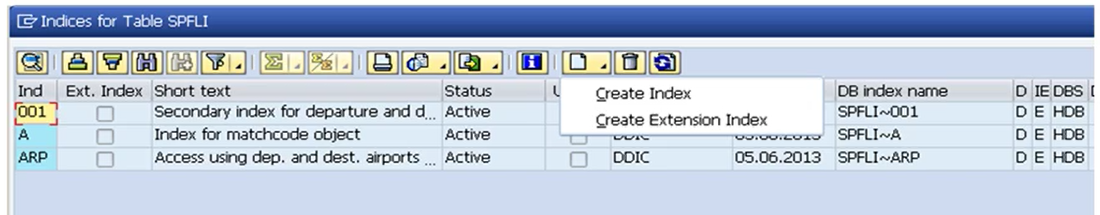 The steps to create a secondary index and extension index are the same. Go to the ABAP Dictionary (SE11) and enter a table name. Choose the Indexes button, then the Create button, and select the index fields.