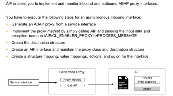 The rest of the implementation can then be done in AIF Customizing. You can create structure mappings, value mappings, actions, and so on as for any other AIF interface.
