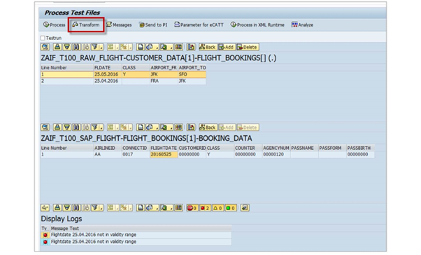 The AIF test tool enables you to test the interface. By executing the test file, you can see, how the data will look like after its transformation. Log messages, which are created during the transformation, are displayed here, too.