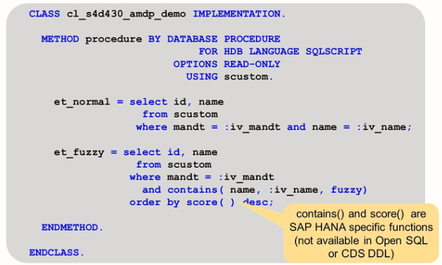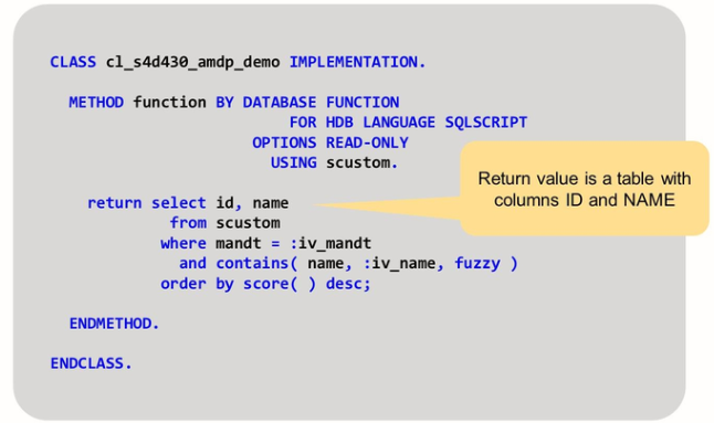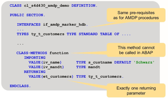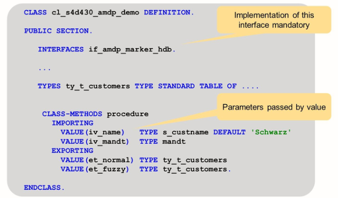 This slide shows the definition of an AMDP class. Implementation of interface IF_AMDP_MARKER_HDB is mandatory.