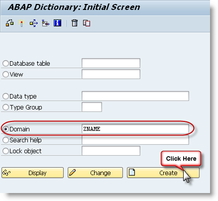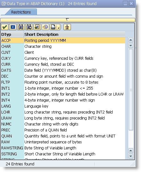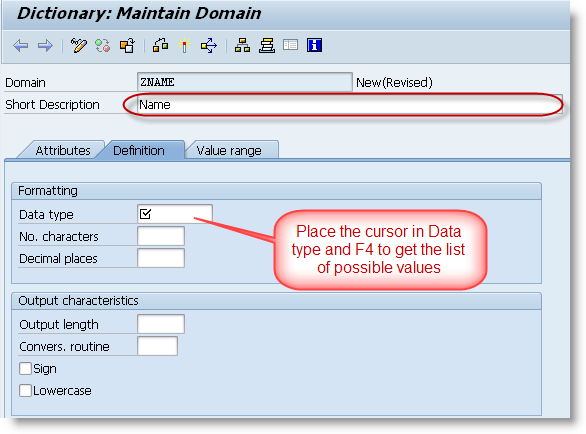 - Enter the short description. Place the cursor in the data type and press F4 to get the list of SAP data types.