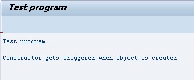 In the following program, we have defined a class cl_construct under which we have declared a constructor by methods statement. We also have a normal method here. At the implementation of this class, we have implemented the constructor & normal method. Now under start of selection event we create an object of that cl_construct class. We didn’t call the methods here. At the output, we see the constructor gets triggered and the code has been executed.