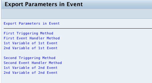 Event can have export parameters which are passed to the event handler method by that event. Here the handler methods need to be declared with importing parameters. The names of those importing parameters will be similar to the exporting parameters of the event. Triggering methods can only pass the value to those parameters by using RAISE EVENT statement. Hence at the time of raise event the triggering method can pass values to the parameters.