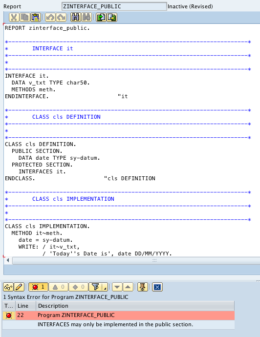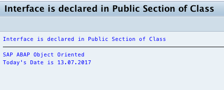 An interface can only be declared in the public section of any class. Any other section will cause a syntax error in the system.
