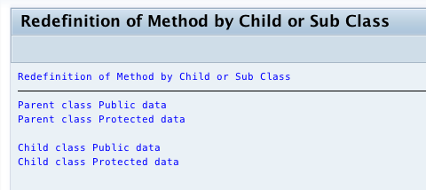 We have a program where we have defined 2 classes - Parent and Child classes. In the Parent class, we have declared data and method in the Public section as well as the Protected section. Next, we have implemented these two methods as well. Then we have declared the child class inheriting from the parent class. There we have declared the same methods in Public and Protected section. The only difference is that we have Redefined these methods by the statement REDEFINITION. Here at the time of implementation, we have changed the functionality of those methods as well. Now in the start-of-selection, we just call the methods by instantiating the classes. In the output, we can have the reflection of parent function as well as child function also.